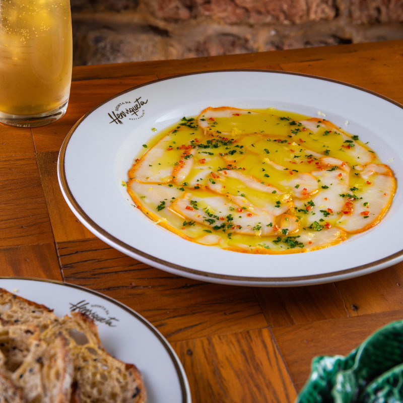 (Lâminas de peixe defumado, servidas com azeite, limão siciliano, pimenta dedo de moça e flor de sal)
