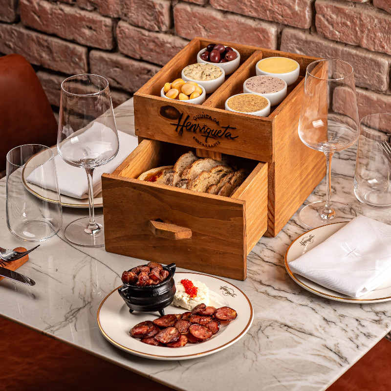 (Pão fermentado natural, pão de enchidos, torrada, azeitona, pasta de atum, tremoços, manteiga, de azeitona e de chouriço, torresminhos, chouricinho do Alentejo, queijo fresco da casa, massa malagueta dos Açores)