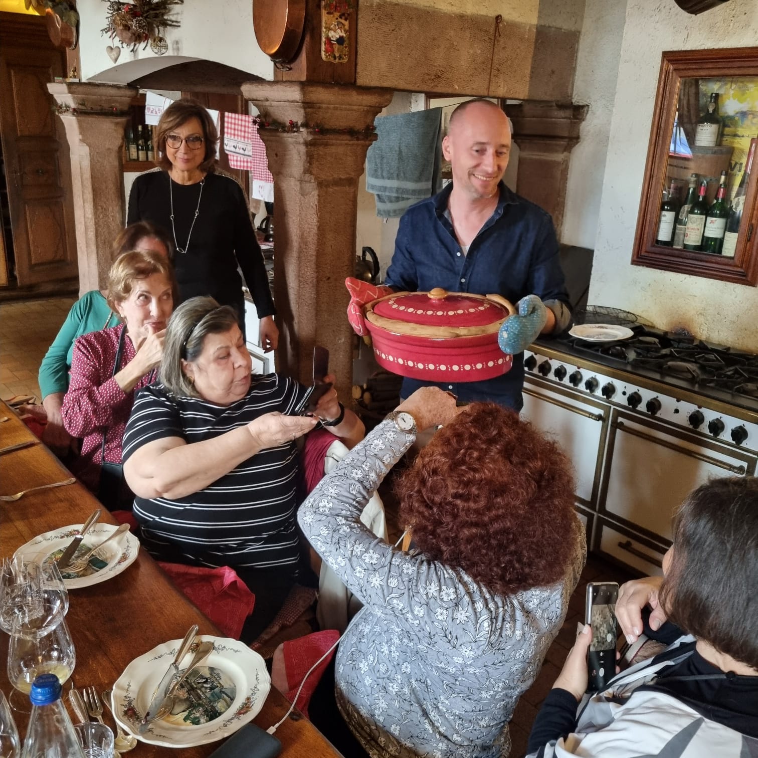 Em Riquewihr, por exemplo, nos deparamos com ruas que exalam charme, construções de famílias abastadas do passado e uma rica história de vinificação. Foi também onde descobrimos o famoso nougat local, um doce macio que nos conquistou. Já em Kaysersberg, o Grand Cru Schlossberg nos ofereceu a oportunidade de entender o terroir em campo, enquanto a recepção calorosa da família Faller no Domaine Weinbach nos fez sentir em casa. A degustação foi enriquecida por explicações detalhadas, e o almoço preparado por Madame Catherine Faller foi um dos pontos altos da viagem, com o tradicional bäckeoffe, uma receita que carrega as memórias das mulheres da região.